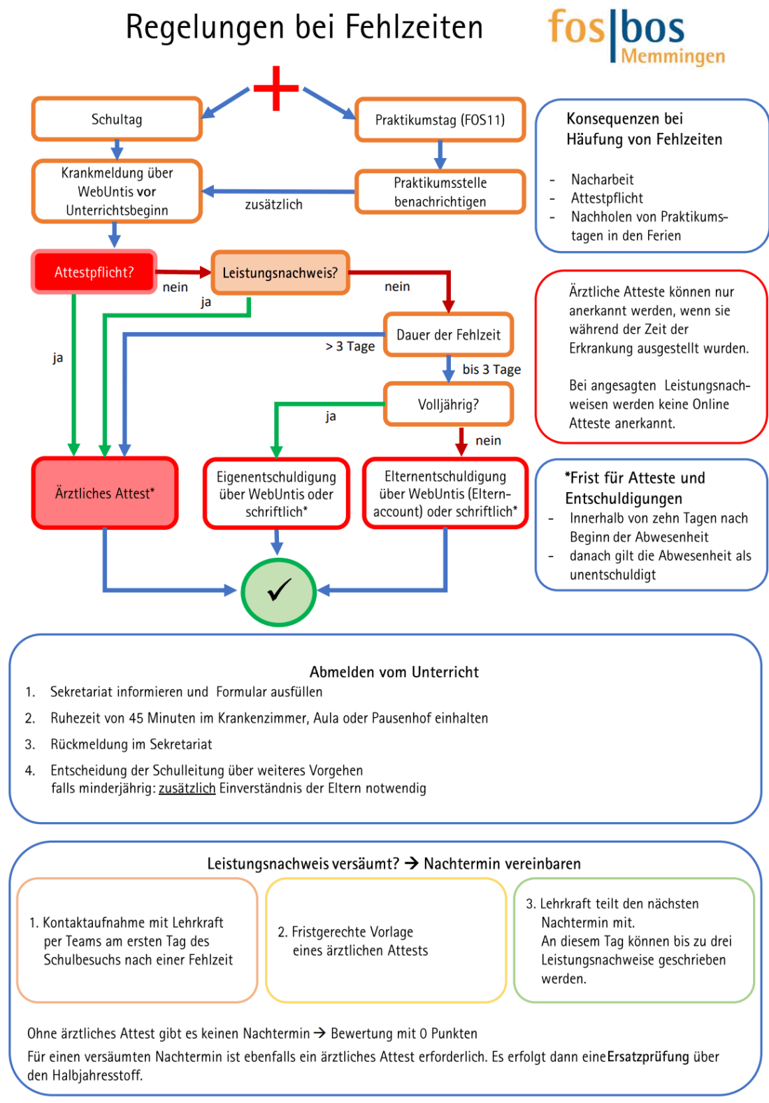 Eine unverzügliche Entschuldigung mit ärztlichem Attest ist immer an Tagen erforderlich, an denen angekündigte Leistungsnachweise stattfinden. Ein Online-Attest wird in diesem Fall nicht akzeptiert. Die Schule kann zudem ein amtsärztliches Attest verlangen. Liegt keine ausreichende Entschuldigung vor, so werden 0 Notenpunkte erteilt.