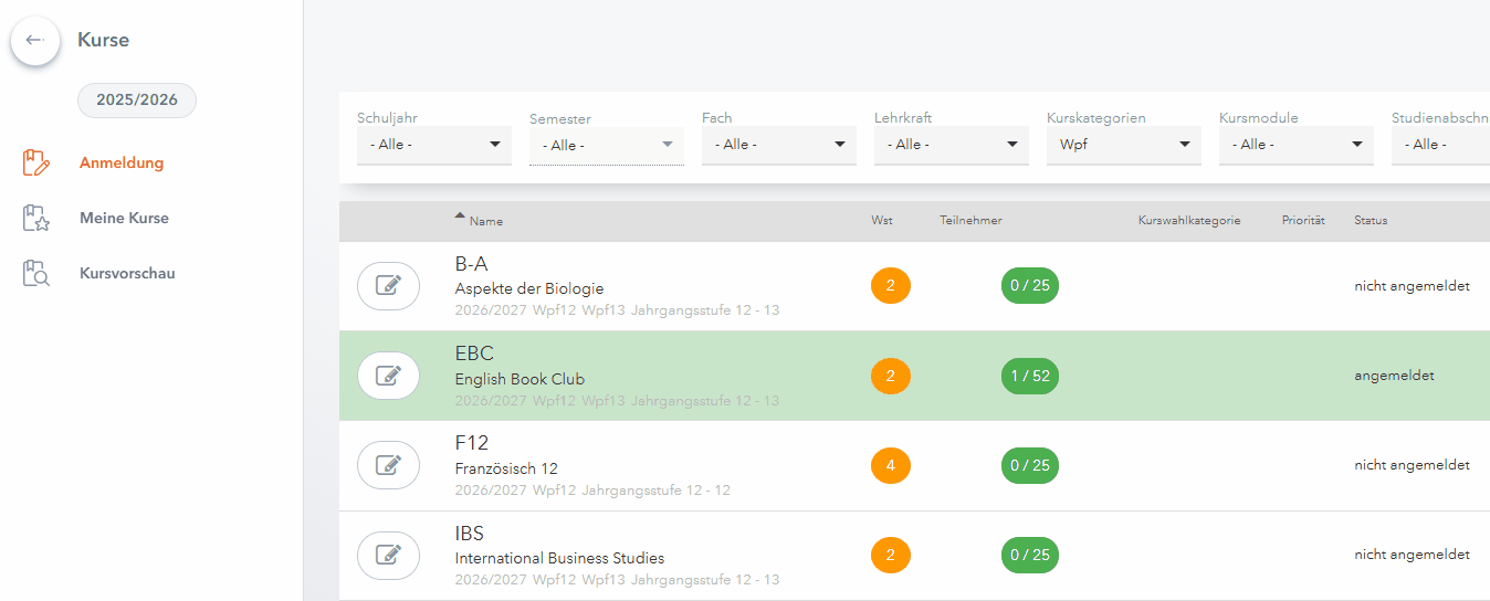 Man kann sich auch wieder von einem Kurs abmelden und stattdessen einen anderen Kurs wählen: